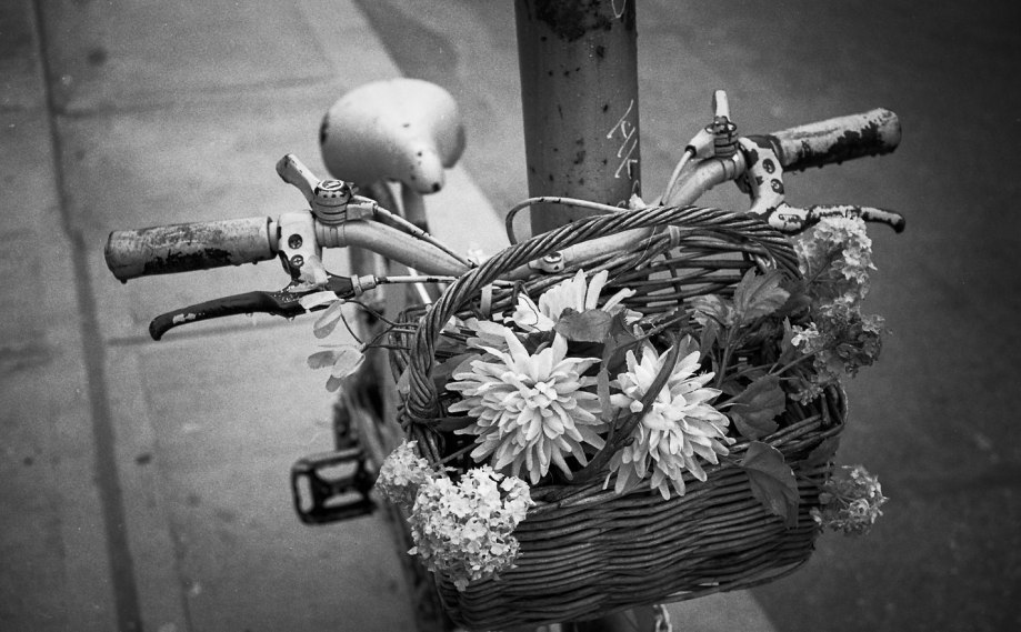 There are a few of these bicycle/flower combos on Queen Street in the Beaches: an ad for a local business. In colour they are a cheery yellow, but I like the look of black and white on a cloudy day.