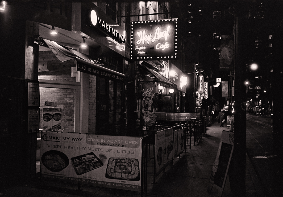 There is a song by The Rankin Family called The Fisherman’s Son, that contains the line: “I stared at the bright lights the dark city ways” and that line comes to mind when I look at this image of King street in the Theatre District at night recently.