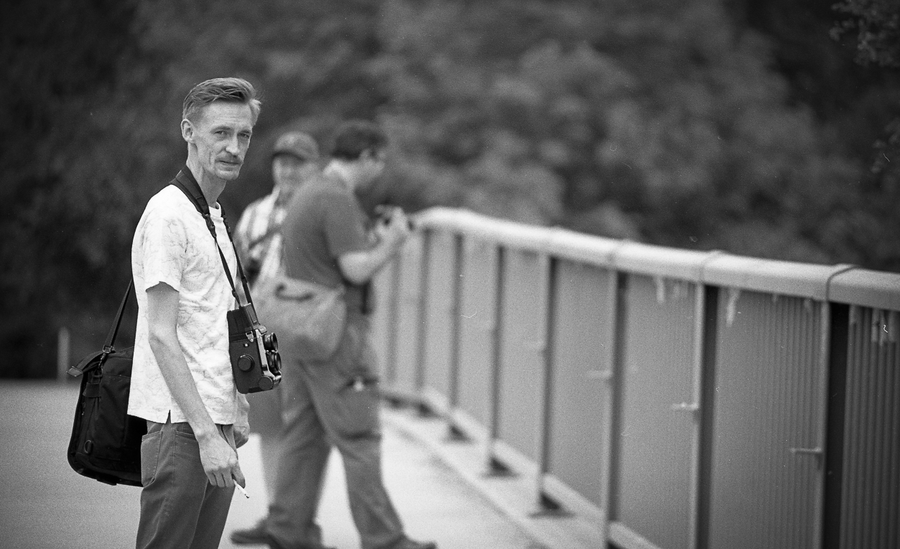 I tend to shoot mainly wide angle and normal lenses, but for the Toronto Film Shooters Photo Walk last Saturday I took out a lens I haven’t used in quite a while: a Nikon 80-200/f4 zoom, from the 1980’s (mounted on my Nikon F5 body). This lens is not small or light, and by today’s standards is not super sharp wide open  but I like the different look I was getting. This is an image of photographer friend Daniel Fast, from some distance away.