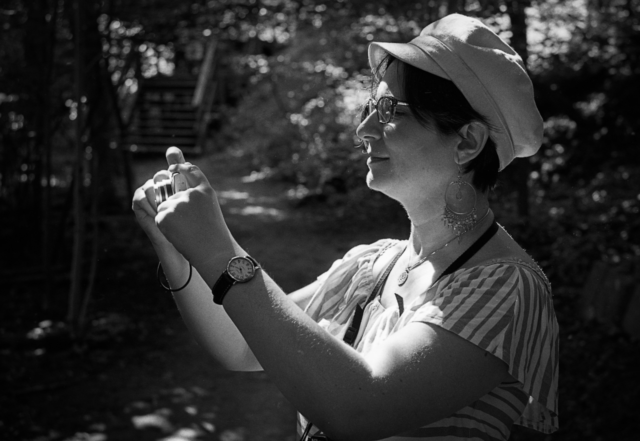 I recently went on a photo outing in the ravine near Yonge/St. Claire in Toronto with my good friend Jo-Anne. She hasn’t shot film in some time but was quite successful using my Nikon EM 35mm SLR. She also shot some digital, as she is doing in this portrait. It was bright sunny day so the forest made for some high contrast, and I like the way the light works in this image!