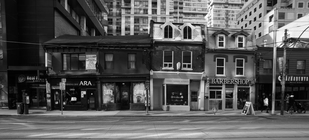 Due to a lot of bad decisions, Toronto is not a city known for amazing architecture. But I have started to enjoy shooting wide shots of row buildings in black and white, cropped to emphasize the horizontal. I took these two last week with my Sony A7ii.