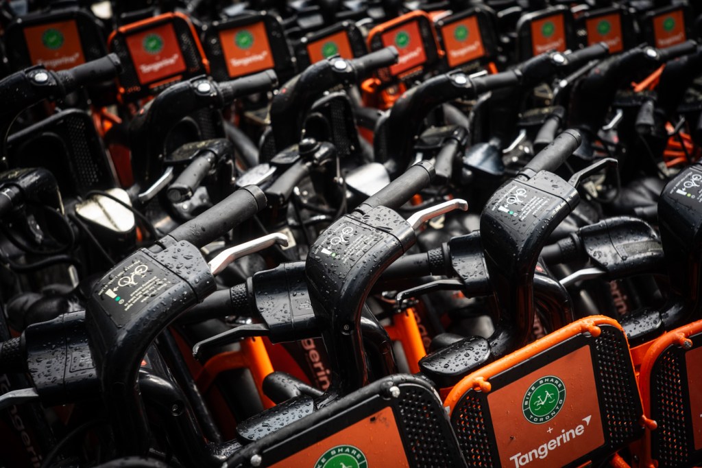 Downtown a few days ago on a morning that became sunny after a brief rain. Plenty of rental bikes, and I like the patterned look they presented.