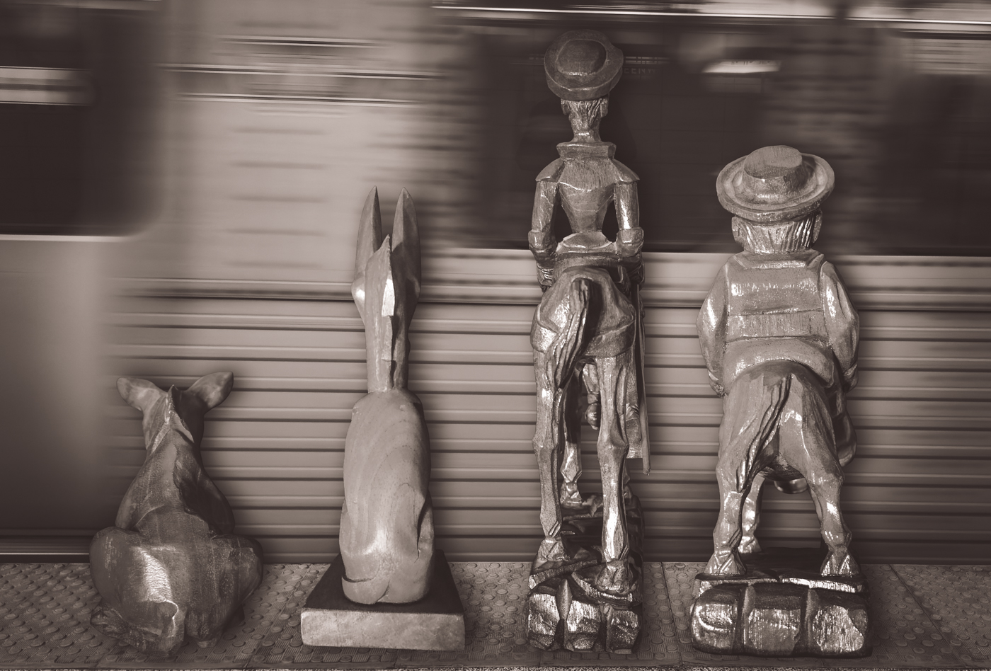 This is another composite image I have been working on. I took an image of a subway train here in Toronto going past me in on the platform, and added images of four carved wooden figures taken separately.
