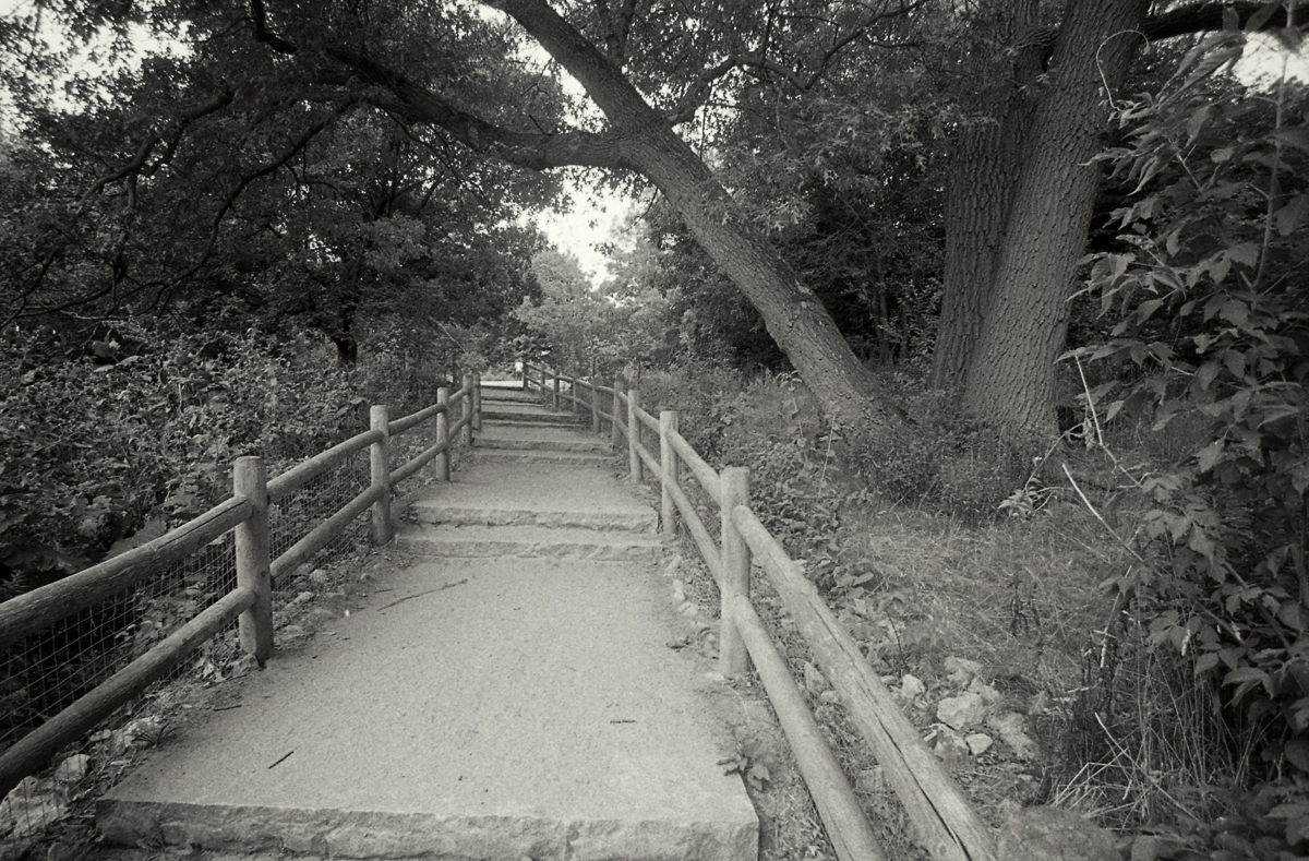Yesterday morning I went out early to the beach in Bluffer’s Park in Scarborough, Ontario. I was shooting on a low speed film (Rollei RPX 25), so everything was on a tripod with slow shutter speeds. The combination of the slow shutter speed and a decent onshore breeze (making for active waves) made for an interesting effect on the water.