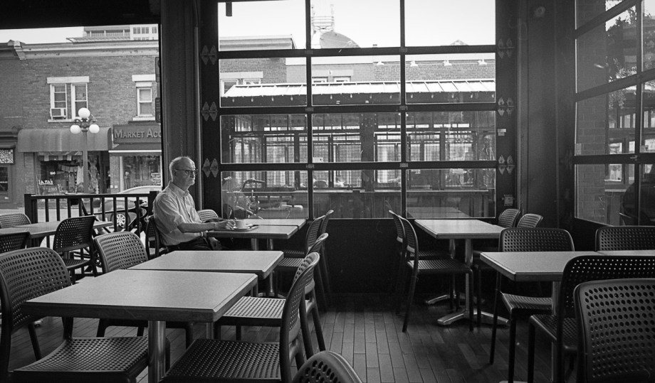 In a recent post I posted a Smartphone/Hipstamatic image of a man sitting on his own in a coffee shop in Ottawa. While there I took a film shot with a wide angle lens for a different view, still emphasizing the isolation.