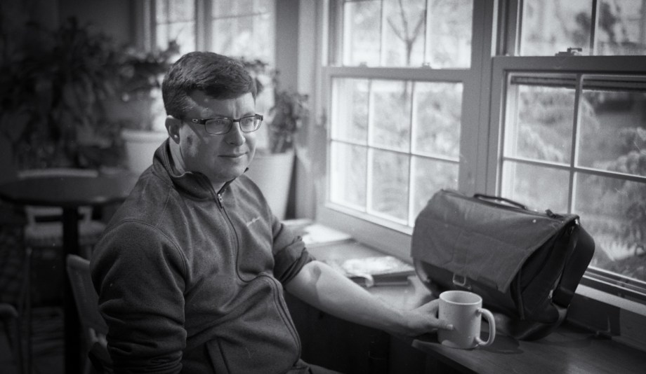 I tend to avoid wide-angle lenses for portraits; they tend not to be very flattering. The angle and distance from the subject in this portrait (my friend, and fellow photographer and podcaster Alex Luyckx) made it work. The light of an overcast day coming through the window was amazing.