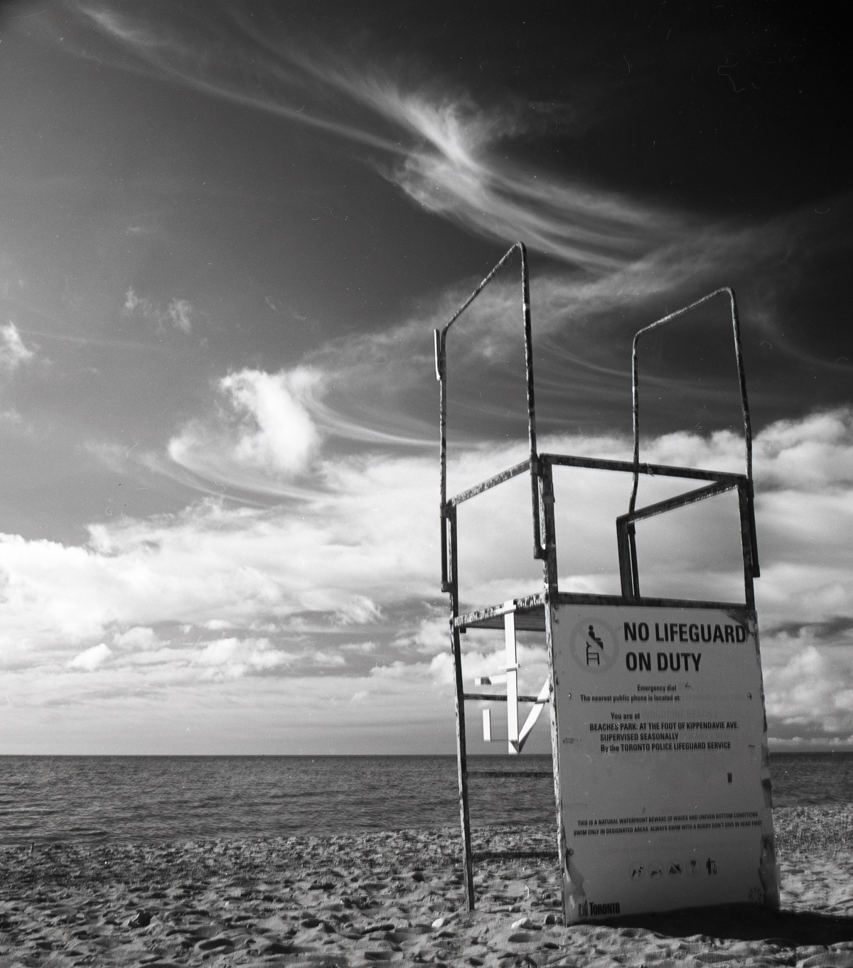 I’ve always wanted to get a dramatic sky photo, and finally I’ve found the combination! Rollei Retro 80s film, plus a 25A red filter and Polarizing filter stacked together. I took this with my Mamiya RZ67 and 65mm lens early on a Sunday morning at the Beaches, with the sun at a right angle, for maximum polarizing effect.