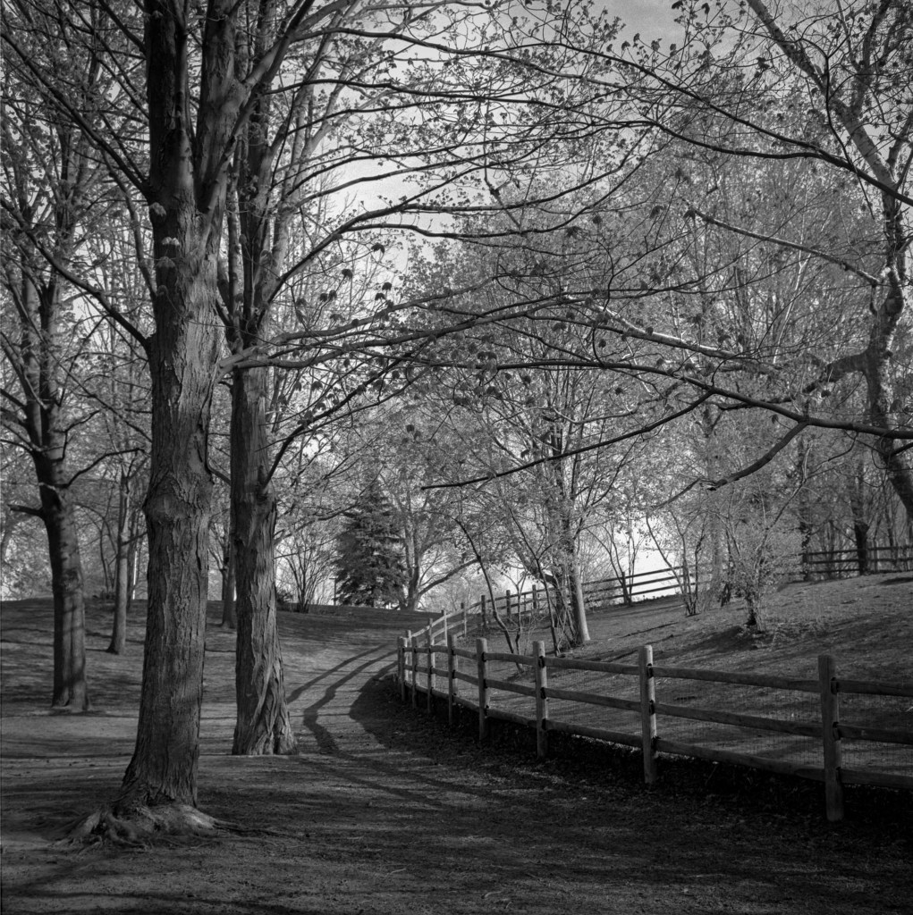 In a park not far from home, in May of this year. I shot both images with my Rolleiflex 3.5E3 camera on Ilford Delta 400 film.