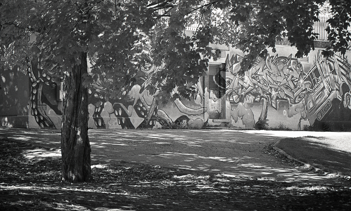 I like how the light in the trees sort of merges with the graffiti in the background.