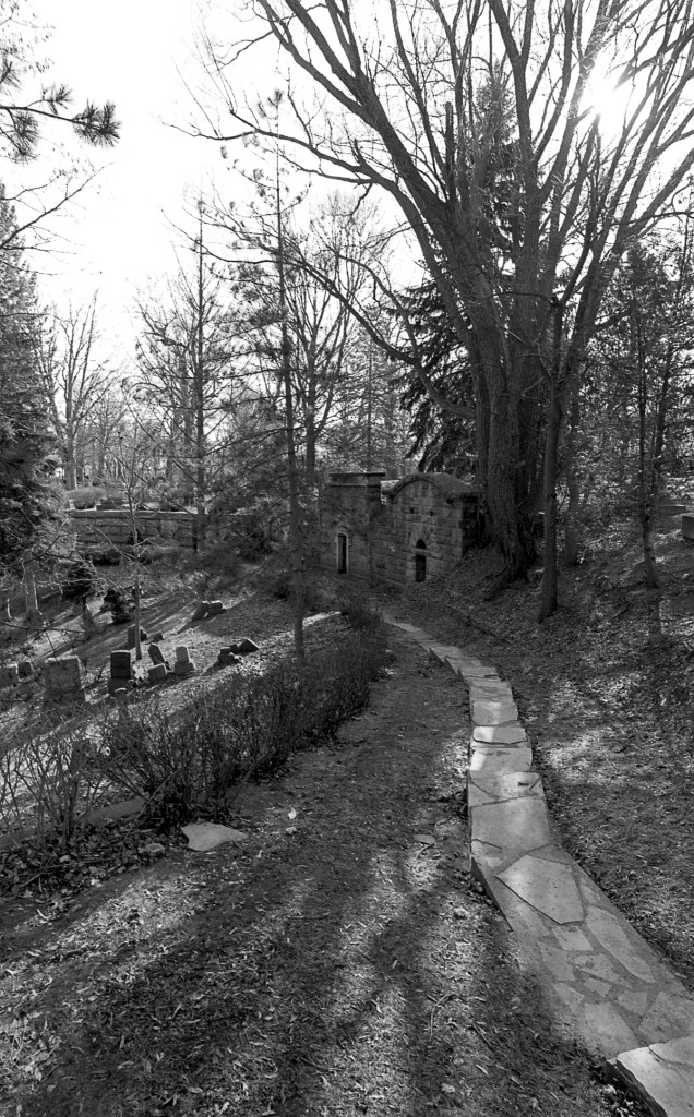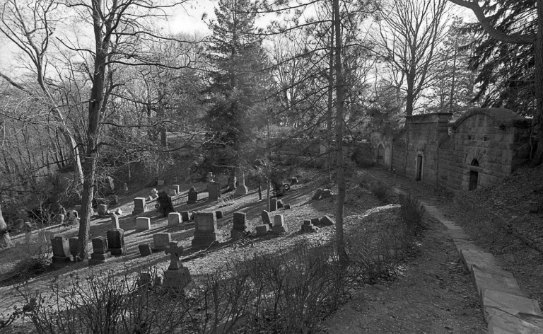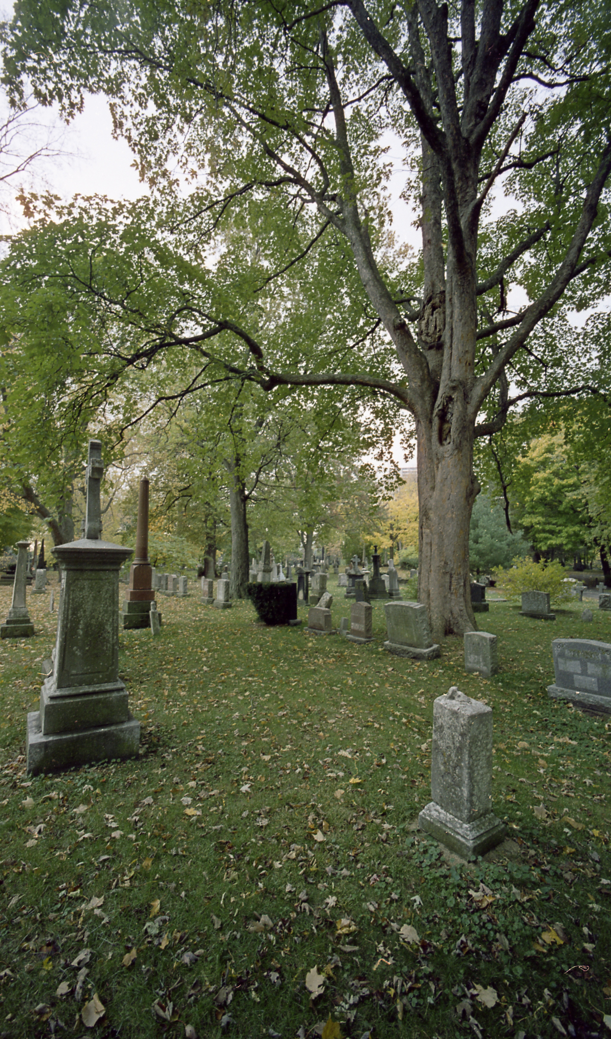 Yesterday at St. James Cemetery: the dazzling sunshine and shade from the leaves still left on the tree made for very contrasty lighting, but the film/developer combination did a decent job in holding a lot of the shadow detail.