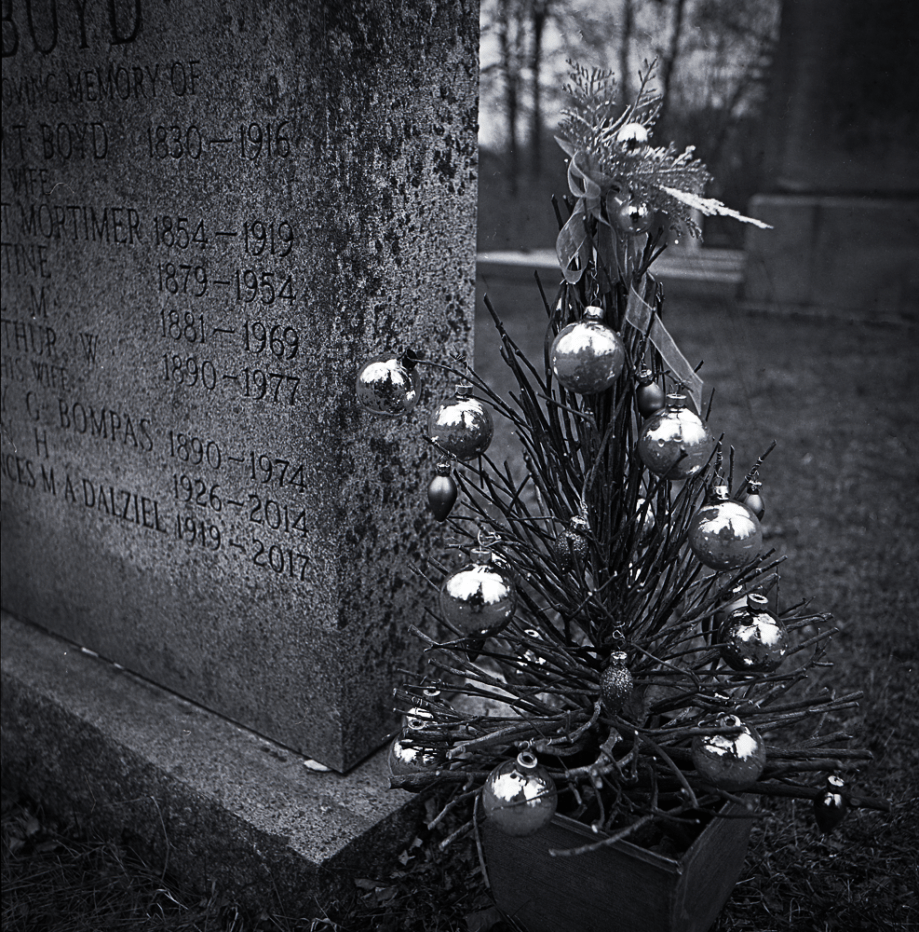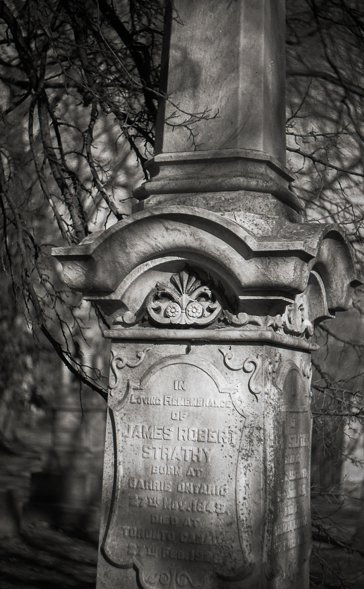 I am continuing to experiment with my Helios 44/2 58mm f2 lens adapted for the Nikon mount. To get the signature swirly, out of focus bokeh this lens is known for having a suitable background a few feet away from the subject, as well as shooting wide open at f2. This attempt is from St. James Cemetery in Toronto, the subject being a tilted old memorial.