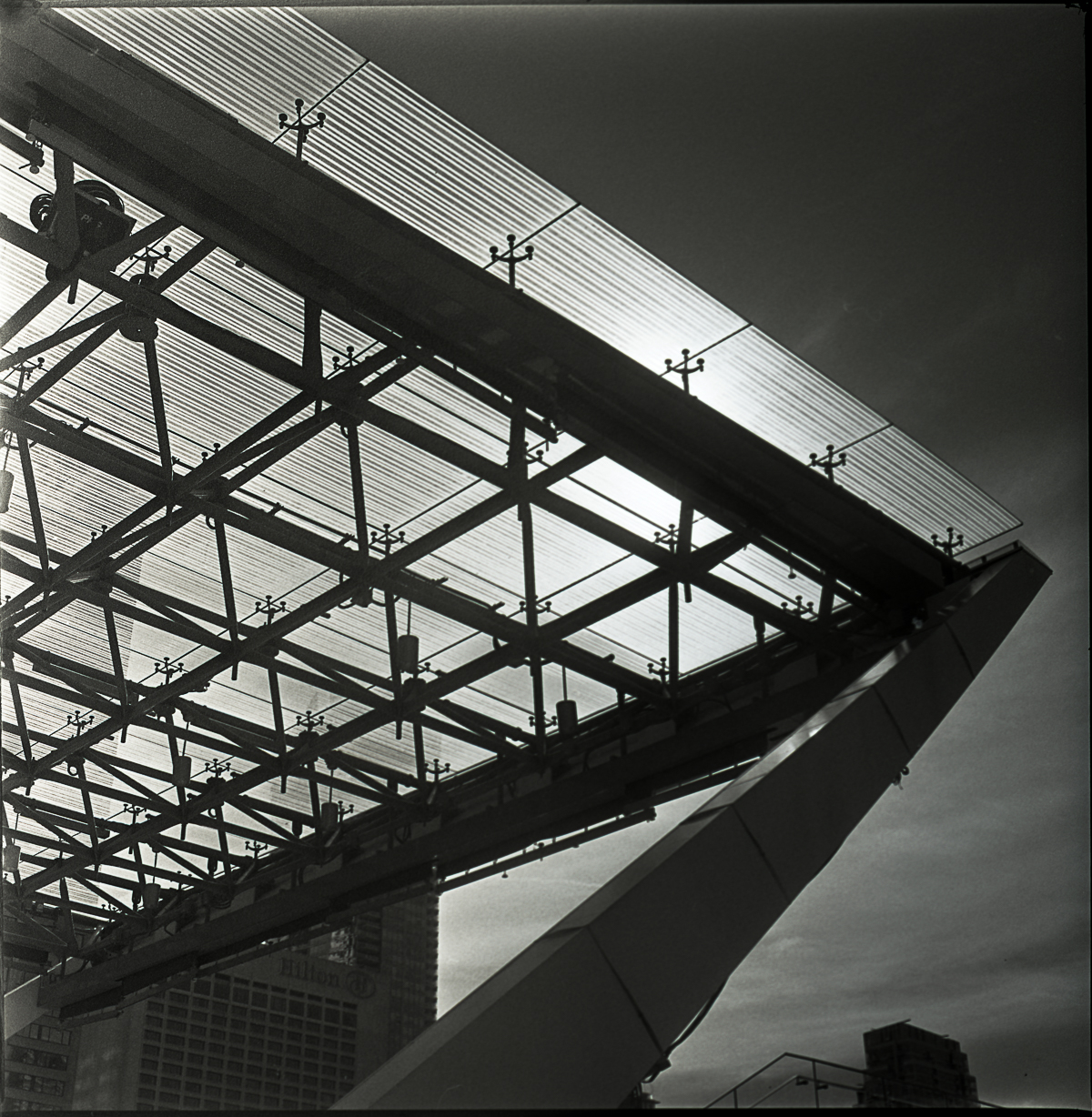 I was out on Friday with the Hasselblad, and took this image in Nathan Phillips Square. I used a roll of expired Tri-X Professional, and as it turned out the film back I was using will have to have its light seals replaced, as there was some fogging. But the combination of technical issues resulted in a look I quite like. I had to walk around a bit to get the correct angle for the sun, so I didn’t get blinded 🙂
